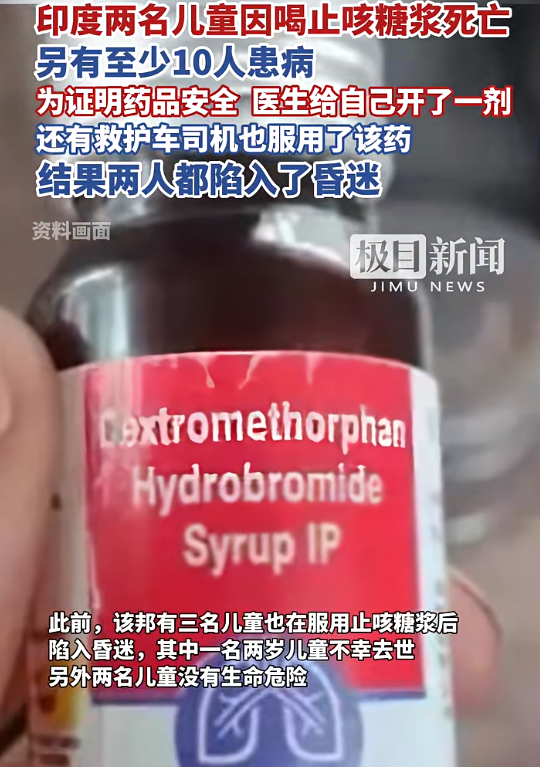 据潇湘晨报报道,近日印度拉贾斯坦邦再曝止咳糖浆安全事故。凯森制药公司生产的该类药品已造成2名儿童死亡、至少10人患病。甚至有医生为证药品安全服药后陷入昏迷。